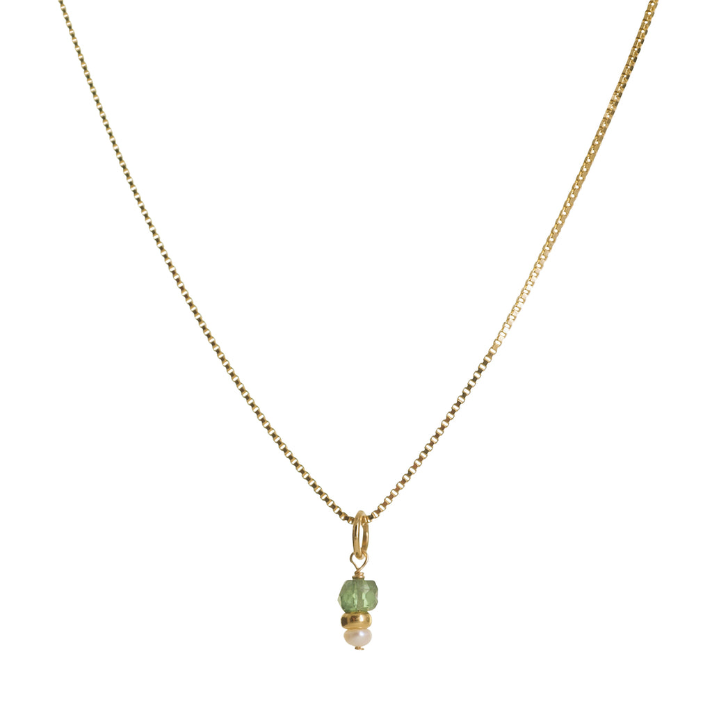 Het collier is handgemaakt van hoogwaardig goldfilled materiaal en versierd met een bedel van apatiet-edelsteen en een fijn pareltje