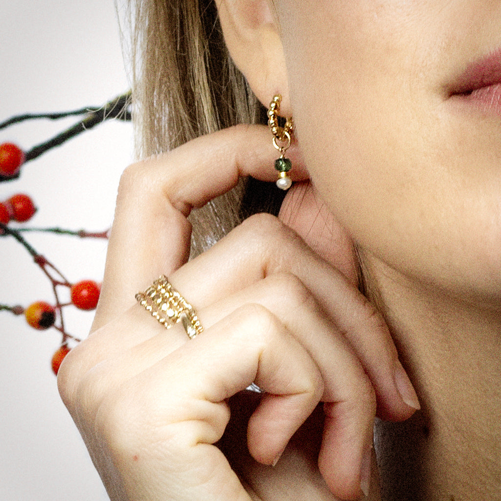 De Wintertrail oorringen zijn handgemaakt van goldfilled materiaal met een subtiel bolletjesreliëf.